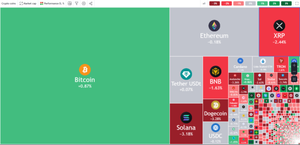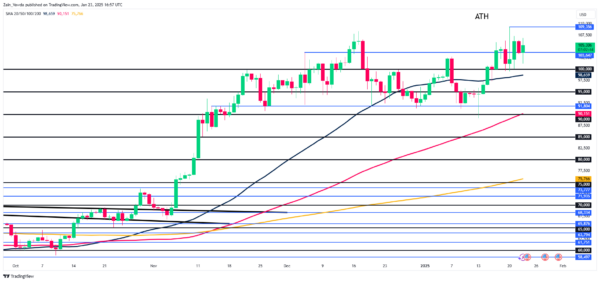 Bitcoin (BTC/USD) from a technical standpoint on the daily timeframe sees price stuck in the range between the psychological 100000 handle and the all-time highs around 109356.
