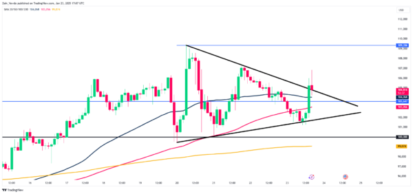 The triangle mouth measures around $10,000 which would mean a rally of around $10,000 to the upside which could see Bitcoin prices reach the 115000 mark should the pattern play out.