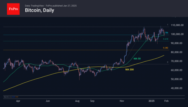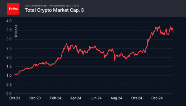 The cryptocurrency market sometimes exhibits higher volatility compared to the Nasdaq index. On Monday, the cryptocurrency market decreased by 6.5% to reach $3.38 trillion, while the Nasdaq100 was down 2.5%. This was due to the emergence of the startup DeepSleek with its free AI. These concerns were heightened with the anticipation of this week’s Fed meeting and profit-taking following crypto-related orders from President Trump.