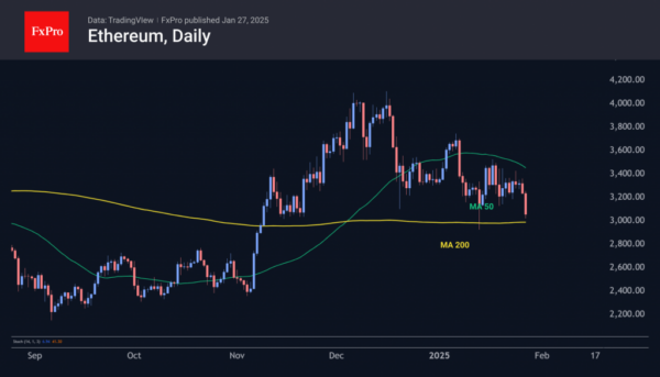 Ethereum has also been affected by the sell-off, falling to $3000 — the area of lows since November, and temporarily touching the 200-day moving average on Monday. A fall below this level would signal a potential trend change to bearish.