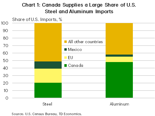 Canada is the most exposed to these tariffs as the largest supplier of U.S. steel and aluminum, accounting for nearly 50% of aluminum and 20% of steel imports (Chart 1). However, these metals make up only 6% of Canada’s total merchandise exports. Regionally, Quebec dominates aluminum, while Ontario leads in steel exports, making both provinces most exposed.