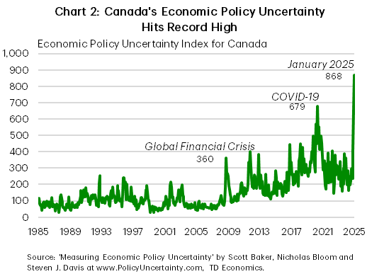 Meanwhile, the uncertainty surrounding U.S. trade policy is already weighing on Canada’s economy. The Economic Policy Uncertainty Index for Canada hit a record high in January, before the first tariff announcement (Chart 2). Research suggests that heightened policy uncertainty discourages business investment, as firms delay or scale back capital expenditures. The Bank of Canada’s Summary of Governing Council Deliberations, released Wednesday, reinforced this concern, noting that tariff threats “would almost certainly damage business investment in Canada”.