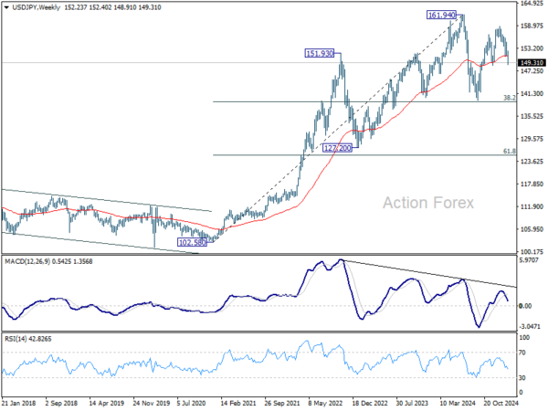 In the bigger picture, price actions from 161.94 are seen as a corrective pattern to rise from 102.58 (2021 low). In case of another fall, strong support should be seen from 38.2% retracement of 102.58 to 161.94 at 139.26 to bring rebound. However, sustained break of 139.26 would open up deeper medium term decline to 61.8% retracement at 125.25.