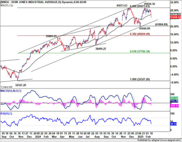 Technically, DOW’s steep decline and strong break of 55 D EMA (now at 43848.97) is clearly a near term bearish sign. However, current fall from 45054.36 are seen as the third leg of the corrective pattern from 45073.63 only. Hence, while deeper fall could be seen to medium term rising channel support (now at around 42530) or below, strong support should emerge around 41884.89 to complete the pattern and bring up trend resumption.