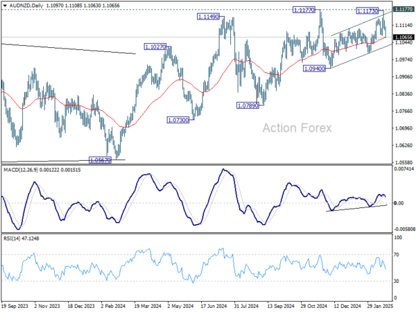 Technically, sustained trading below 55 D EMA should confirm rejection by 1.1177 resistance. Fall from 1.1173 would be seen as the third leg of the corrective pattern from 1.1177. Further break of near term channel support (now at 1.1029) would pave the way back to 1.0940 support next.