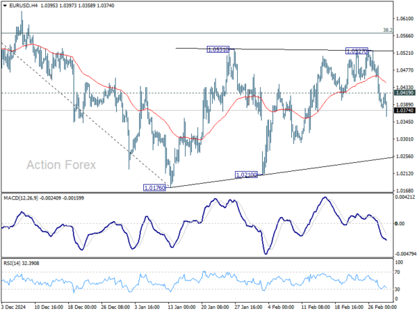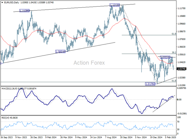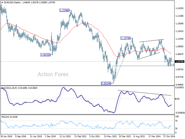 In the bigger picture, immediate focus is on 61.8 retracement of 0.9534 (2022 low) to 1.1274 (2024 high) at 1.0199. Sustained break there will solidify the case of medium term bearish trend reversal, and pave the way back to 0.9534. However, reversal from 1.0199 will argue that price actions from 1.1274 are merely a corrective pattern, and has already completed.