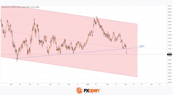 Today, Brent crude is sliding towards the psychological $70 per barrel mark, with the XBR/USD chart showing a break below a key support level (marked in blue) that had been holding since autumn last year.
