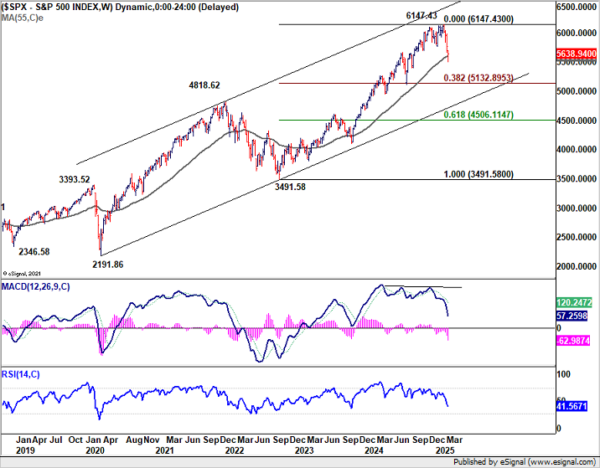 For S&P 500, fall from 6147.43 is currently seen as a correction to the up trend from 3491.58 (2022 low) only. While further decline remains in favor, downside should be contained by 38.2% retracement of 3491.58 to 6147.43 at 5132.89.