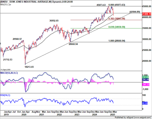 Similarly, DOW should now be in correction to the whole rally from 28660.94 (2022 low). While further fall is expected, downside should be contained by 38.2% retracement of 28660.04 to 45703.63 at 38803.98. However, sustained break of this fibonacci level will argue that larger scale reversal is underway.