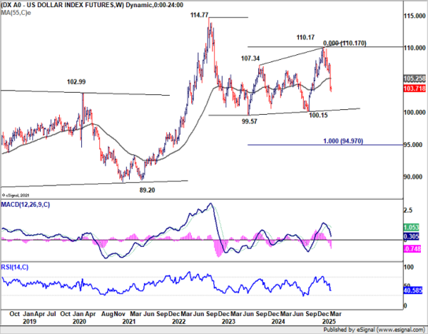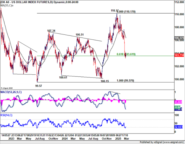 Technically, Dollar Index is now hovering around 61.8% retracement of 99.57 to 110.17 at 103.61. This level could provide some short-term stabilization, particularly as D RSI also suggests oversold conditions. Some consolidations might follow first, or even a notable recovery.