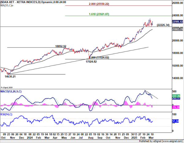 For DAX, near term outlook stays bullish with 22226.34 support intact. Current trend should continue to 161.8% projection of 14630.21 to 18892.92 from 17024.82 at 23921.87. Decisive break there would pave the way to 200% projection 25550.22 next.