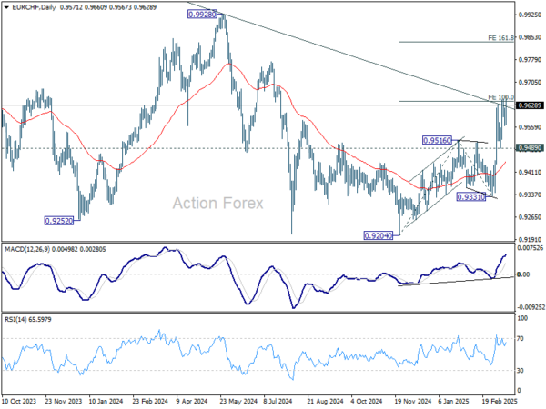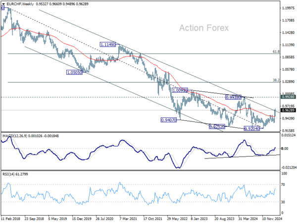 However, break of 0.9489 support will suggest rejection by the channel resistance, and keep outlook bearish for EUR/CHF, which might also be an indication of Euro’s outlook elsewhere.