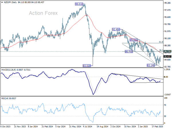 On the upside, NZD/JPY could face strong resistance from 86.71 (38.2% retracement of 92.45 to 83.14 at 86.96). Only a firm break of this cluster resistance zone would confirm bullish trend reversal.