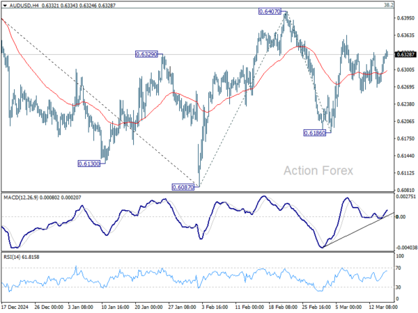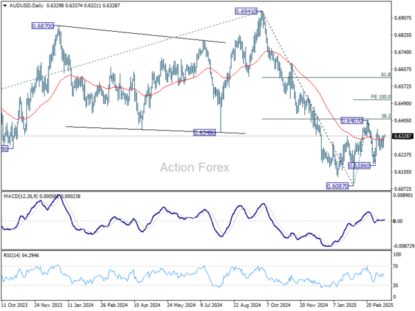 Intraday bias in AUD/USD remains neutral first as range trading continues. On the downside, break of 0.6186 will target 0.6087 support first. Firm break there will resume whole decline from 0.6941. On the upside, sustained break of 0.6407 will resume the rebound from 0.6087 to 100% projection of 0.6087 to 0.6407 from 0.6186 at 0.6506, even still as a corrective move.