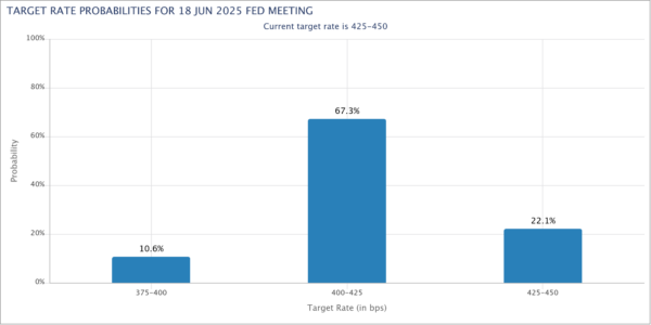 For now, Fed fund futures imply an 88% chance of a rate cut in June, followed by around 70% odds of another cut in September. Still, those odds remain sensitive to upcoming inflation readings, consumer sentiment, and of course, any fresh headlines out of Washington on trade.