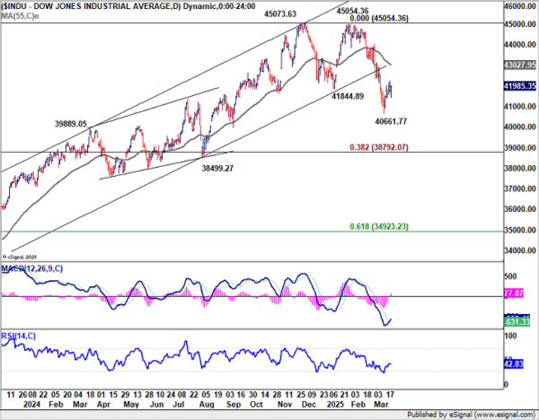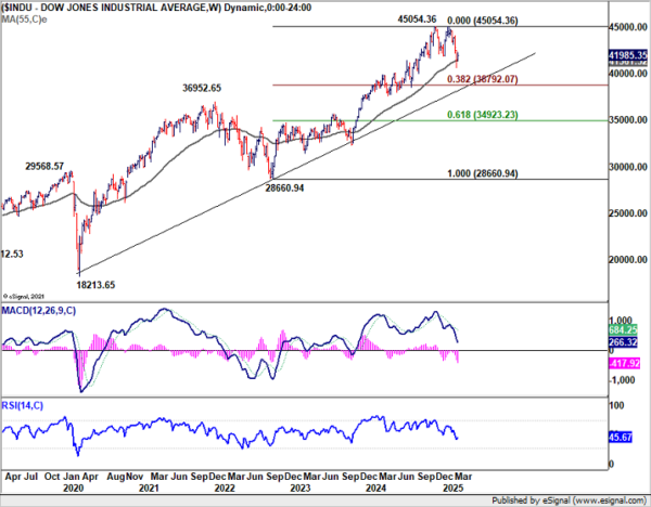 Technically, DOW gyrated higher last week after forming a short term bottom at 40661.77 earlier in the month. The structure of the recovery so far suggests that it’s merely a corrective bounce. Further decline is expected as long as 55 D EMA (now at 43027.95) holds. Fall from 45054.36 is seen as corrective the whole up trend from 28660.94. On resumption, DOW should target 38.2% retracement of 28660.94 to 45054.36 at 38792.07.