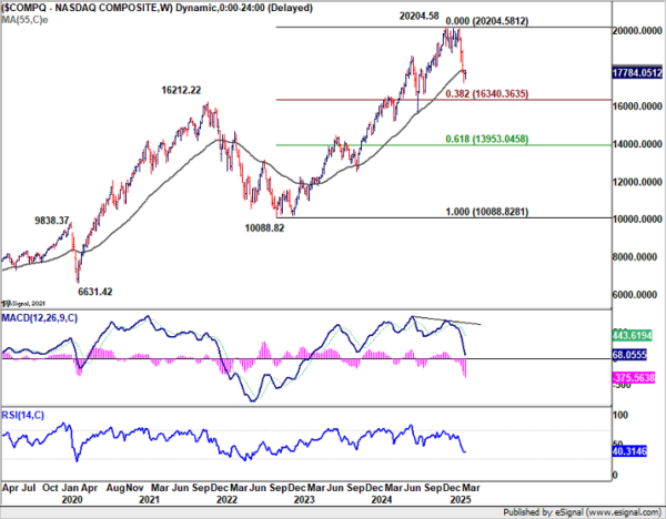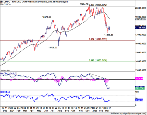 Similarly, NASDAQ turned sideway after forming a short term bottom at 17238.23. While stronger recovery cannot be ruled out, risk will stay on the downside as long as 55 D EMA (now at 18753.98) holds. Fall from 20204.58 is seen as a correction to the ups trend from 10088.82. Break of 17238.23 will target 38.2% retracement of 10088.82 to 20204.58 at 16340.36.