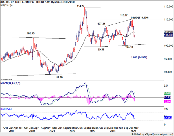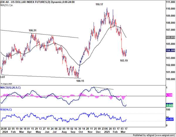 Dollar Index should have formed a short term bottom at 103.19 and turned into consolidations already. Further recovery might be seen in the near term. But there would be strong resistance between 55 W EMA (105.21) and 55 D EMA (now at 105.91) to limit upside. Break of 103.19 will resume the fall from 110.17 to 99.57/100.15 support zone.