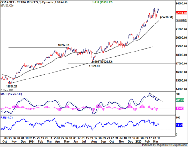 Technically, while DAX still has some room to climb, considering bearish divergence condition in D MACD, upside will likely be limited by 161.8% projection of 14630.21 to 18892.92 from 17024.82 at 23921.87, or in short 24k mark. Break of 22226.34 support will suggest that a correction has started to digest the rally from 17024.82.