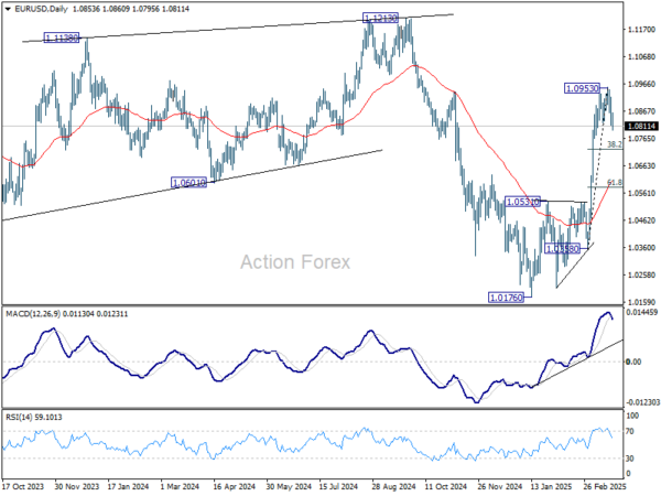 EUR/USD should have completed a short term top at 1.0953 after last week’s pull back. Deeper fall might be seen to 38.2% retracement of 1.0358 to 1.0953 at 1.0726. But strong rebound is expected from there to set the range for a near term corrective pattern.