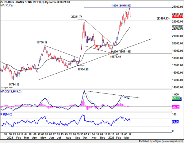 In particular, the rally in Hong Kong stocks appears increasingly stretched. HSI had made a strong push higher since January, but it’s now facing a tough hurdle at the psychologically significant 25,000 mark. That level also aligns closely 100% projection of 16964.28 to 23241.74 from 18671.49 at 24948.95. Combined with bearish divergence in daily MACD, there’s a rising risk that profit-taking could be triggered on any failure to break this resistance zone.