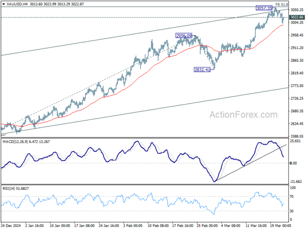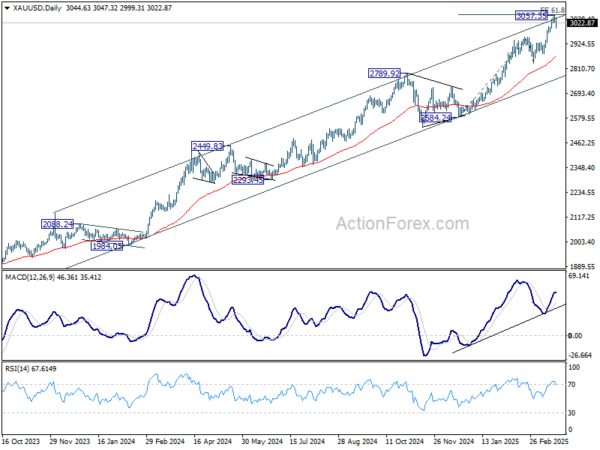 Gold’s impressive record run may have reached a near-term peak as it ran into a confluence of critical resistance zone. The levels include 61.8% projection of 2584.24 to 2956.09 from 2832.41 at 3062.21, and more importantly, medium-term rising channel resistance.