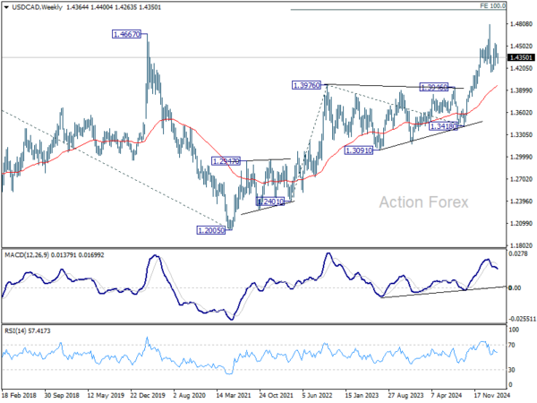 In the bigger picture, long term up trend is tentatively seen as resuming with prior breach of 1.4667/89 key resistance zone (2020/2015 highs). Next target is 100% projection of 1.2401 to 1.3976 from 1.3418 at 1.4993. This will remain the favored case as long as 1.3976 resistance turned support holds (2022 high), even in case of deep pullback.