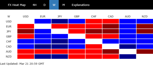For the week, Swiss Franc led the performance chart, followed by Canadian Dollar and the Greenback. Aussie was the weakest, followed by Euro and Yen, while Kiwi and Sterling ended in the middle of the pack.