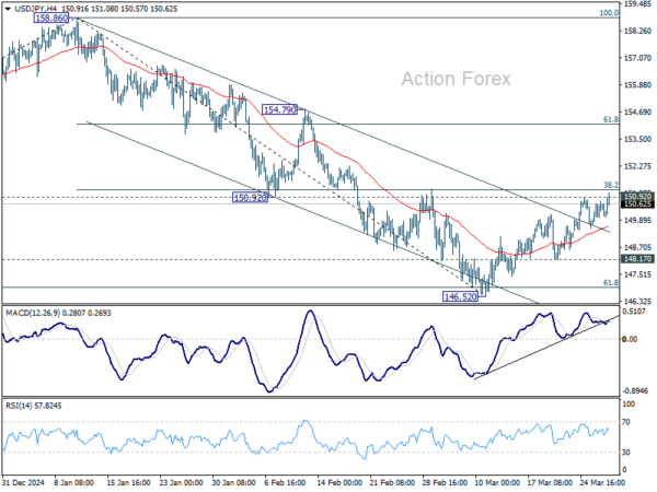 Intraday bias in USD/JPY remains neutral for the moment. Strong resistance is still expected from 150.92 to complete the corrective recovery from 146.52. On the downside break of 148.17 support will bring retest of 146.52 first. Sustained trading below 61.8% retracement of 139.57 to 158.86 at 146.32 will resume the fall from 158.86 to 139.57 support. However, firm break of 150.92 will argue that fall from 158.86 has completed and turn bias back to the upside for 154.79 resistance next.