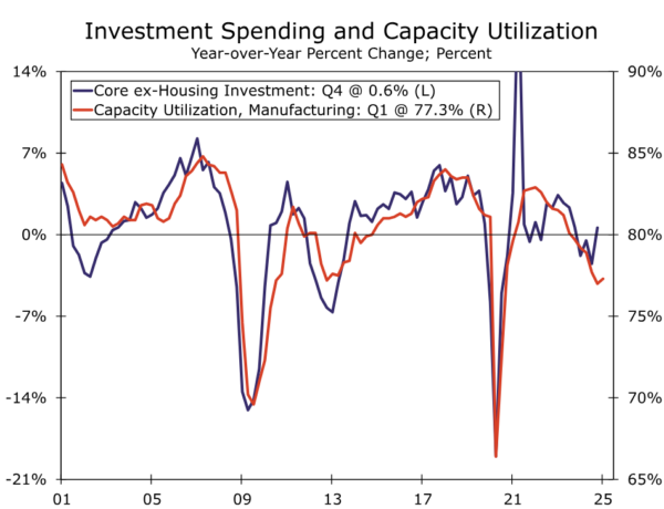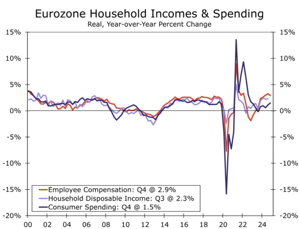 Eurozone GDP rose a moderate 0.2% quarter-over-quarter in Q4-2024 though, with upward revisions to prior quarters, that helped boost growth to 1.4% year-over-year. For the fourth quarter specifically, the expansion in economic activity was quite broad-based, as household consumption rose 0.4% quarter-over-quarter, government consumption also rose 0.4%, and investment spending rose 0.6%. The increase in investment spending was also notable in that it included an increase in core ex-housing investment (that is, excluding the volatile intellectual property products component). For now, growth in employee compensation and household disposable income continues to run ahead of consumer spending, suggesting there remains room for a further modest consumer recovery over the course of this year. The near-term outlook for investment spending is more mixed, however, given softening corporate profits and still-low levels of manufacturing capacity utilization.