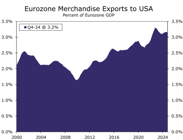 Indeed, the uncertain near-term outlook for investment spending and broader economic activity has been compounded by the growing threat of higher tariffs from the United States. President Trump has often highlighted the large trade imbalance with Europe, as well as some internal taxes within Europe. The latest available figures highlight that trade imbalance, with the Eurozone running a €183 billion merchandise trade surplus with the United States in the 12 months through January. Considering this backdrop, we anticipate the European Union will indeed face higher tariffs from the United States. From Q2-2025 and through the end of our forecast horizon (Q4-2026), we assume a 10% effective tariff rate on goods imported from the European Union, with a similar level of retaliation from Europe on the United States.