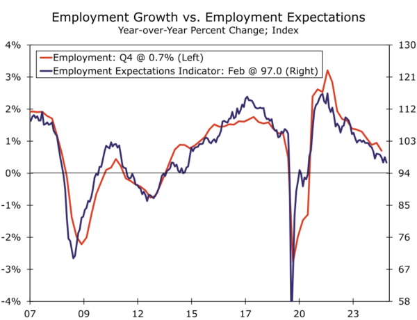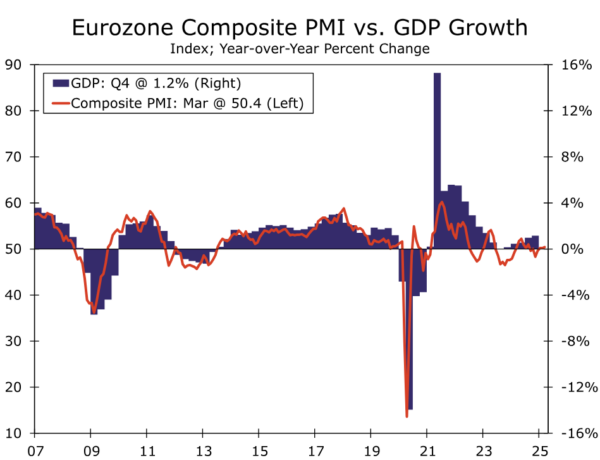 The direct impact of higher tariffs on the Eurozone will, we think, be moderate, with merchandise exports to the United States accounting for a little more than 3% of the region’s GDP in 2024. That said, given the increased uncertainty stemming from increased trade and tariff tensions, the indirect effects on activity could be more pronounced. Indeed, there are signs that a more uncertain environment is already weighing on employment and spending decisions. For example, the European Commission Employment Expectations Indicator fell further to 97.0 in March, extending what had been an overall declining trend since early 2022. The further drop in the indicator suggests that employment growth, which was already just a tepid 0.7% year-over-year in Q4, could slow even further this year.