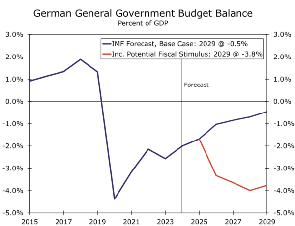 Altogether, the measures could be a momentous change for the German economy, and ultimately (though to a lesser extent) the broader Eurozone economy. To the extent an exemption of defense spending from the debt brake frees up room for spending that previously counted against the deficit limits, it could create potential space for ~1% of GDP for spending in other areas going forward. Should the federal government and states be able to fully utilize the leeway from the constitutional changes, that would equate to fiscal stimulus of 1.35% of GDP, while the infrastructure fund would equate to another 1% of GDP. While increased spending might not ramp up immediately, that suggests potential German fiscal stimulus of around 2.3% of GDP over the next several quarters, a development that should be beneficial for the 2026 growth outlook in particular. Should German defense spending indeed rise, German overall fiscal stimulus could amount to more than 3% of GDP over the next several years. That overall magnitude of German fiscal stimulus is also equates to Eurozone fiscal stimulus of 0.7%-0.9% of Eurozone GDP over the next several quarters to years. Even with higher tariffs, we view more expansive fiscal policy as a net positive for the region’s economy, and have lifted our forecast Eurozone GDP growth forecast for 2026 to 1.6%. We also expect fiscal stimulus to kickstart Germany’s economy, which has been a significant underperformer within the Eurozone in recent years.