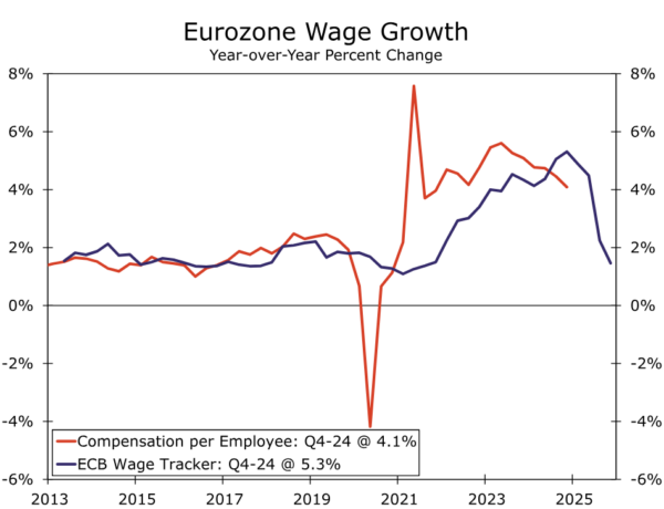 While most wage and inflation indicators are moving in a favorable direction, they remain at levels that are likely not consistent—not just yet, at least—with CPI inflation converging sustainably toward the central bank’s 2% inflation target. Q4 compensation per employee slowed to 4.1% year-over-year, with productivity on a per-person basis up just 0.4% over the same period, unit labor costs also rose 3.7%. We would view wage growth of closer to 3%, and unit labor cost growth of closer to 2%, as more consistent with inflation converging sustainably towards target. That is particularly the case given the possibility of a modest uptick in goods inflation amid a global backdrop of higher tariffs. The ECB’s Wage Tracker offers some encouragement that wage growth will indeed slow further, but amid a more balanced growth backdrop, policymakers may wish to see confirmation of that deceleration before proceeding with further easing. From a price perspective, the latest CPI reading for February saw core inflation at 2.6% year-over-year and services inflation at 3.7%. The latter would require a persistently low level of goods inflation to sustainably achieve the 2% target, a low level of goods inflation that might be more difficult to achieve given the current tariff dynamics.