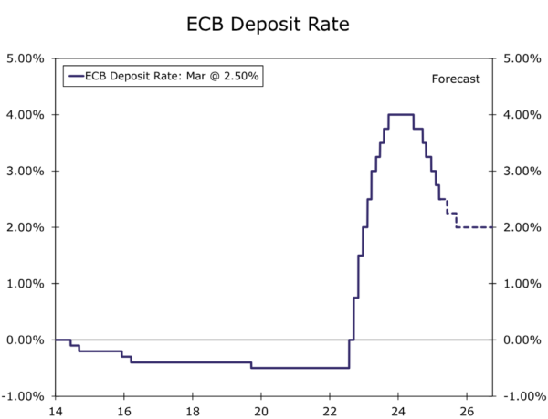 Finally, the ECB earlier this year published research suggesting the neutral policy rate for the Eurozone lies in a region of 1.75% to 2.25%, though of course that estimated range is subject to inherent uncertainty. Still, given a more balanced outlook, we see less need for the ECB to “undershoot” its neutral policy rate, but rather simply return its policy interest rate towards a neutral range. In addition, a more balanced outlook perhaps argues for less urgency in adjusting the central bank’s monetary policy setting. To be sure, an April rate cut is still possible, and may depend on whether there is a further significant deceleration is services inflation in March. Our base case, however, is for more gradual and less pronounced ECB monetary easing than we had previously envisaged. We expect the ECB to pause in April, cut rates 25 bps in June, pause in July, and cuts rates 25 bps in September, for the ECB’s policy rate to reach a low of 2.00% by later this year. A firmer medium-term growth outlook and less dovish European Central Bank also has implications for the outlook for the European currency, especially when juxtaposed against our evolving U.S. outlook which sees softer GDP growth in 2025, and slightly faster Fed easing this year. In terms of our medium-term forecast we see a much more gradual pace of euro depreciation over the next several quarters than previously, and target a EUR/USD exchange rate of $1.02 by Q3-2026.