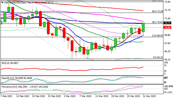 However, the sentiment remains firmly bullish, as the latest acceleration contributes to scenario of firm break of $70.00 and $70.62 (Fibo 38.2% of $79.35/$65.22 / 100DMA), to generate signal of continuation of bull-leg from $65.22 (2025 low, posted on Mar 5).