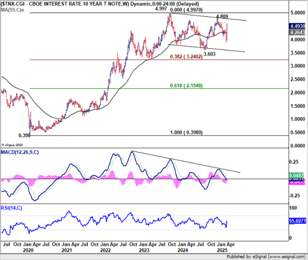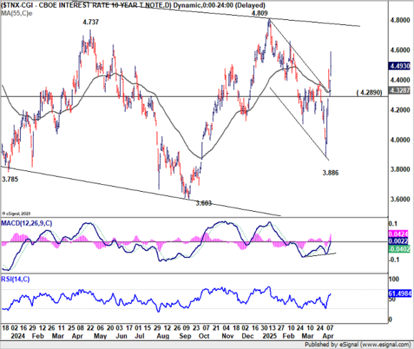 Technically, the picture in US 10-year yields is worrying but not yet in panic mode. For the near term, the decline from 4.809 should have bottomed at 3.886% as a correction. As long as 4.289 support holds, further rise toward 4.809 is expected.