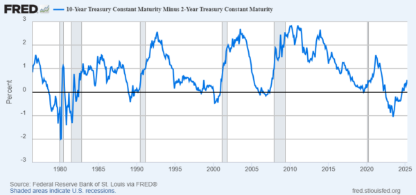 Adding to the concern is the historical warning from the yield curve, something that we have mentioned a number of times. The spread between the US 10-year and 2-year Treasuries—the classic recession signal—inverted in mid-2022 and uninverted last August. Historically, this un-inversion has preceded recessions around 6 to 12 months. That puts the timeline for a economic downturn squarely within 2025. That clock is ticking.