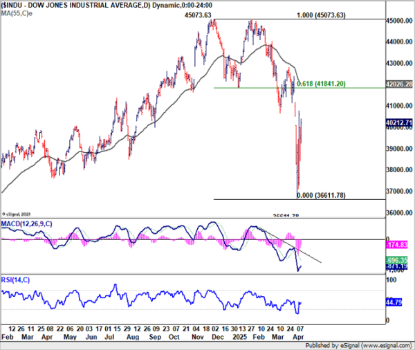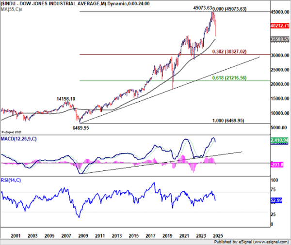 Technically, DOW’s defense of 55 M EMA (now at 3558.57) keeps long-term uptrend from 6369.96 (2009 low) alive. For the near term tough, firm break of 61.8% retracement of 45703.63 to 36611.78 at 41841.20 is needed to confirm that correction from 45703.63 has completed. Without that, the best investors can expect is range-bound consolidation.