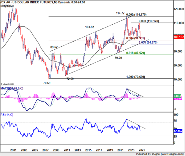 Dollar Index dived to as low as 99.01 last week as fall from 110.17 reaccelerated. The break of 100.15 support (2024 low) affirms the case that whole down trend from 114.77 (2022 high) is resuming. Further break of 99.57 (2023 low) should confirm this bearish case. Meanwhile, near term risk will stay heavily on the downside as long as 103.22 support turned resistance holds, even in case of recovery.