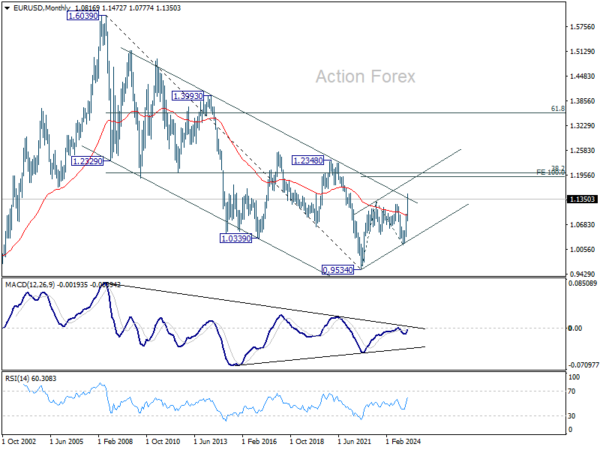 The development in EUR/USD should also be considered. Last week’s break of 1.1274 resistance (2023 high) should confirm resumption of whole rise from 0.9534 (2022 low). More importantly, EUR/USD is now breaking through the falling channel resistance that lasted more than 1.5 decade. Rise from 0.9534 is likely to extend to 100% projection of 0.9534 to 1.1274 from 1.0176 at 1.1916, or slightly further to 38.2% retracement of 1.6039 (2008 high) to 0.9534 at 1.2019.
