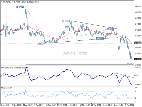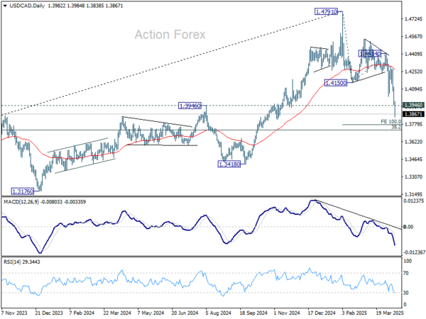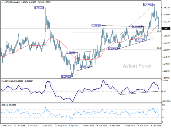USD/CAD’s fall from 1.4791 high continued last week and accelerated through 1.3946/76 key support zone. There is no sign of bottoming yet. Initial bias stays on the downside this week for 100% projection of 1.4791 to 1.4150 from 1.4414 at 1.3773. On the upside, break of 1.4150 support turned resistance is needed to indicate short term bottoming. Otherwise, outlook will stay bearish in case of recovery.