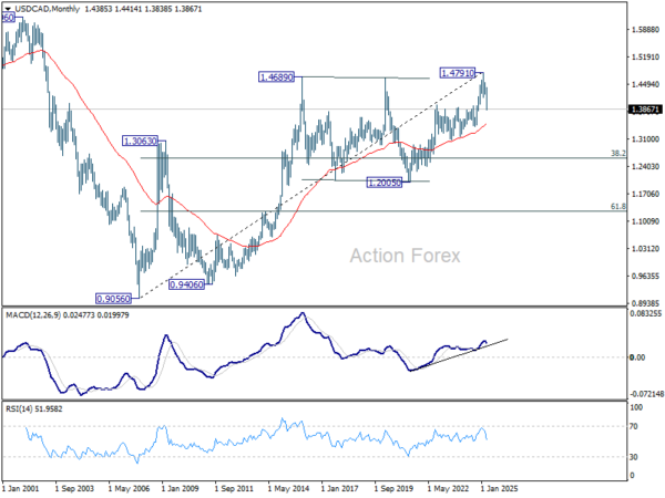 In the bigger picture, the break of 1.3976 resistance turned support (2022 high) and 55 W EMA (now at 1.3992) indicates that a medium term is already in place at 1.4791. Fall from there would either be a correction to rise from 1.2005, or trend reversal. In either case, firm break of 38.2% retracement of 1.2005 (2021 low) to 1.4791 at 1.3727 will pave the way back to 61.8% retracement at 1.3069.