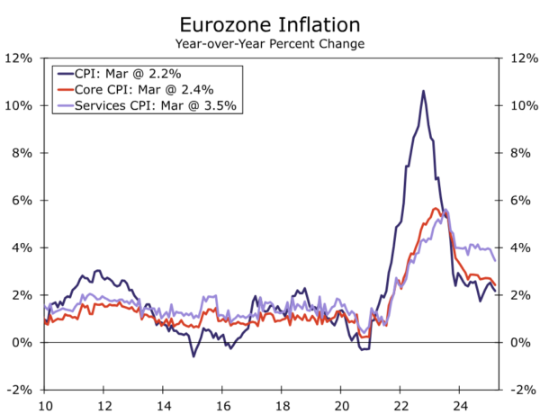 In terms of resilience, growth in real household disposable incomes continues to outpace consumer spending, while the housing saving rate remains elevated at 15.3%. However, today’s announcement suggests the central bank is placing limited weight on those factors and focusing instead on cyclical trends. On that front, sentiment surveys remain subdued. The Eurozone manufacturing and service sector PMIs were barely in growth territory in March, and the consensus forecast is for some further softening in April. That is consistent with our own outlook, as we recently revised our Eurozone GDP growth outlook lower to 0.6% for 2025 and 1.3% for 2026. The underwhelming Eurozone growth outlook and continued downside risks firmly argue for further easing.