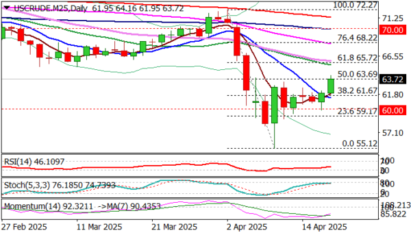 However, recovery may face increased headwinds as technical studies on daily chart are predominantly negative and still fully bearish on weekly, suggesting that much stronger work at the upside is still required to improve the picture (sustained break above cracked Fibo 50%, reinforced by daily Kijun-sen at $63.63, seen as minimum requirement).