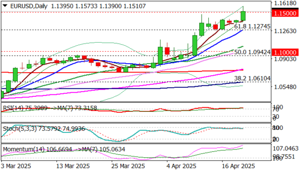 EURUSD surged through 1.15 barrier and hit new multi-year high as effect from worsening fundamentals was boosted by a holiday-thinned market on Easter Monday.