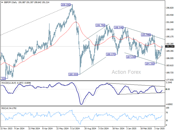 Intraday bias in GBP/JPY remains on the upside at this point. Rise from 184.35 would target 195.95 resistance next. Firm break there will suggest that choppy decline from 199.79 has also finished too. On the downside, below 189.28 minor support will turn intraday bias neutral first.