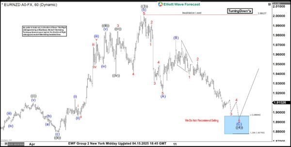 EURNZD has maintained a bullish corrective cycle since the lows of April 2015. The structure evolving is a double zigzag pattern for wave ((IV)) of the supercycle degree of the all-time bearish cycle. Meanwhile, it should be noted that this wave ((IV)) has not yet reached the target. Often times, corrective structures reach the extreme we expect unless price dictates otherwise. So far nothing of such information from the price. Thus, we continue to look forward to a higher prices until wave ((IV)) ends at the extreme area. Meanwhile, while it’s in progress, we explained to members why they should buy pullback in 3, 7 or 11 swing setup from the blue box. Thus, Group 2 members understand how to go about the trade. Good for us, a pullback emerged from the peak of April 2025. We were patient to see the pullback emerged into a clear 3-swing structure.