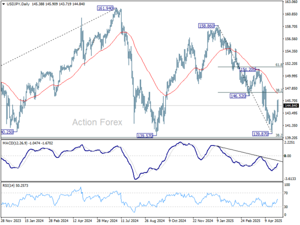 USD/JPY’s rebound from 139.87 short term bottom continued last week but retreated after hitting 145.90. Initial bias remains neutral this week first. Overall near term outlook will stay bearish as long as 38.2% retracement of 158.86 to 139.87 at 147.12 holds. Break of 141.96 will argue that the rebound has completed as a corrective move. Retest of 139.87 should then be seen next in this case.