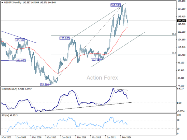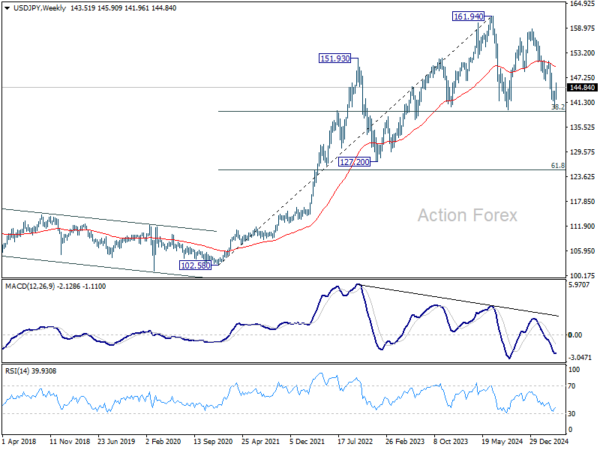 In the bigger picture, price actions from 161.94 are seen as a corrective pattern to rise from 102.58 (2021 low), with fall from 158.86 as the third leg. Strong support should be seen from 38.2% retracement of 102.58 to 161.94 at 139.26 to bring rebound. However, sustained break of 139.26 would open up deeper medium term decline to 61.8% retracement at 125.25.